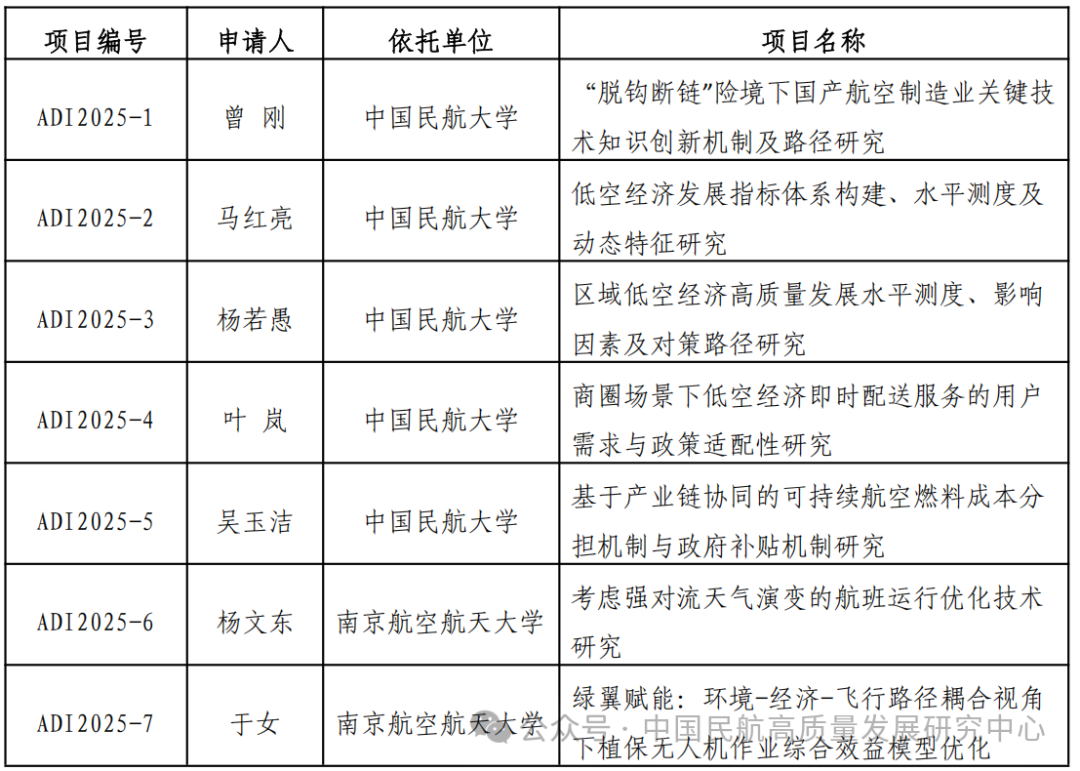 中国民航高质量发展研究中心2025年度开放基金课题立项公示