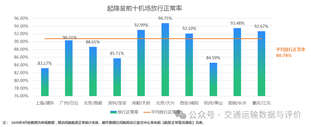 2025年9月份,旅客吞吐量占全国0.2%(含)以上机场平均放行正常率90.79%,其中21个机场放行正常率低于平均值。