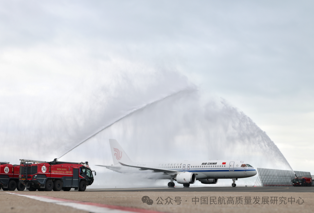 C919首次身披五星红旗执行北京至香港航线,飞机缓缓穿过水门,接受民航界最高礼遇。当天下午,