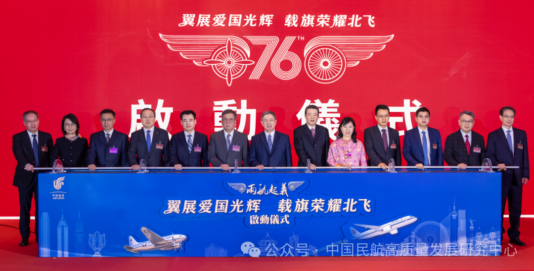 汇聚一堂,共庆C919载旗执飞香港航线圆满成功,并举办“国航C919重飞‘两航起义’北飞光辉航程”系列主题活动启动仪式,嘉宾代表共同按下启动装置,宣布