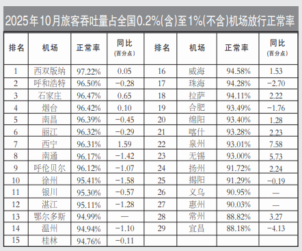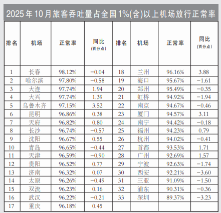 国内主要机场按照2023年旅客吞吐量划分,分为旅客吞吐量占全国1%(含)以上机场及0.2%(含)至1%(不含)机场。2025年10月国内主要机场平均放行正常率94.67%,同比上升0.02个百分点。