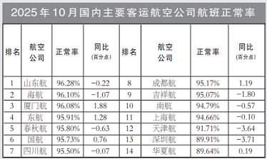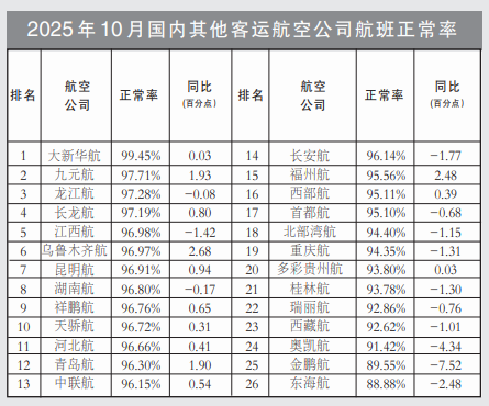 2024年执行的航段班次占国内客运航空公司总航段班次2%(含)以上的航空公司为国内主要客运航空公司。执行的航段班次占国内客运航空公司总航段班次2%以下的航空公司为国内其他客运航空公司。2025年10月国内客运航空公司平均航班正常率94.96%,同比下降0.13个百分点。