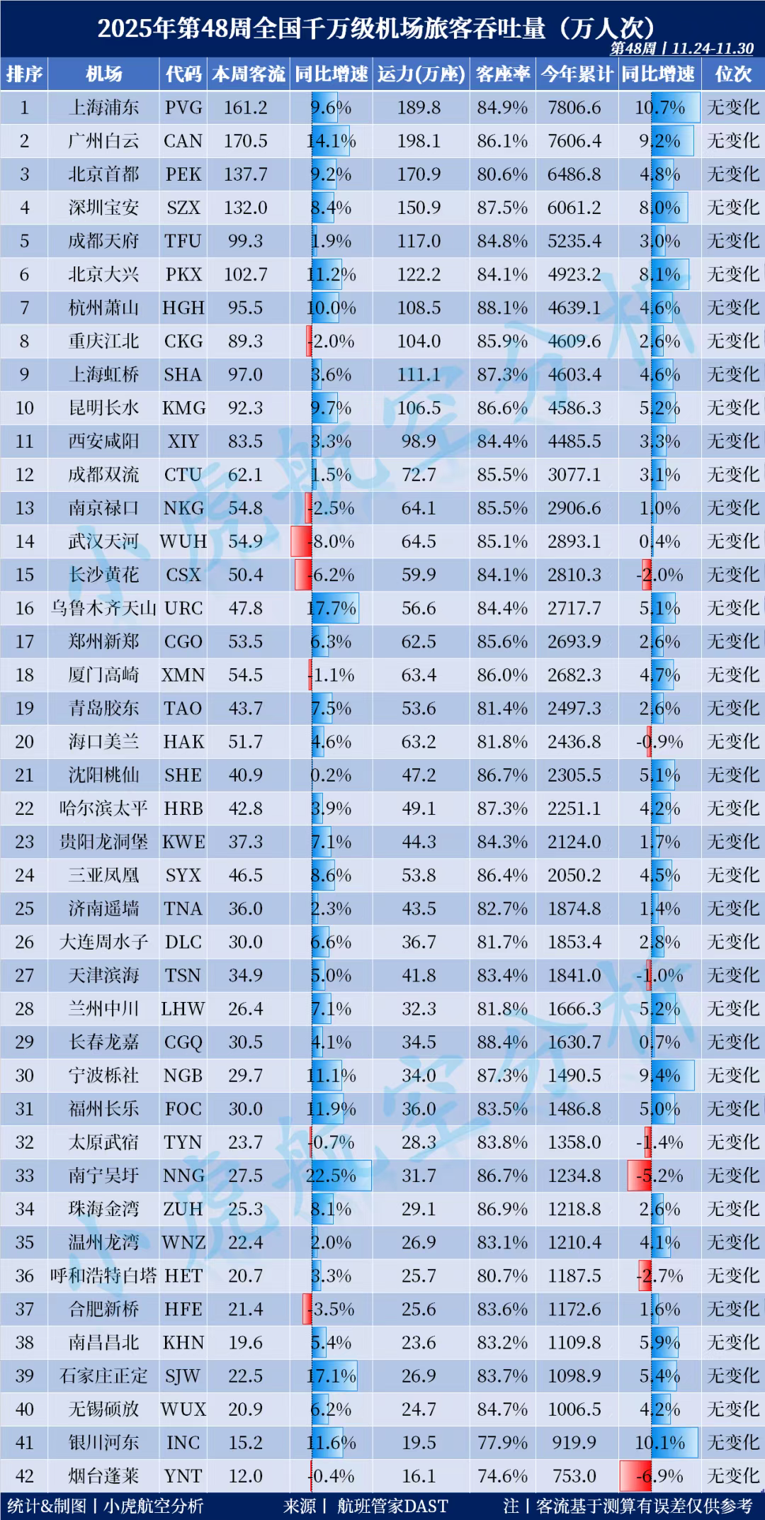 2025年第48周全国千万级机场旅客吞吐量出炉!(第48周:11月24日至11月30日)小编整理了截至第48周42座千万级机场的客流量变化情况。[“周客流”系列为快报实时统计,基于测算有误差,今年累计栏每周会校对]#机场周客流量