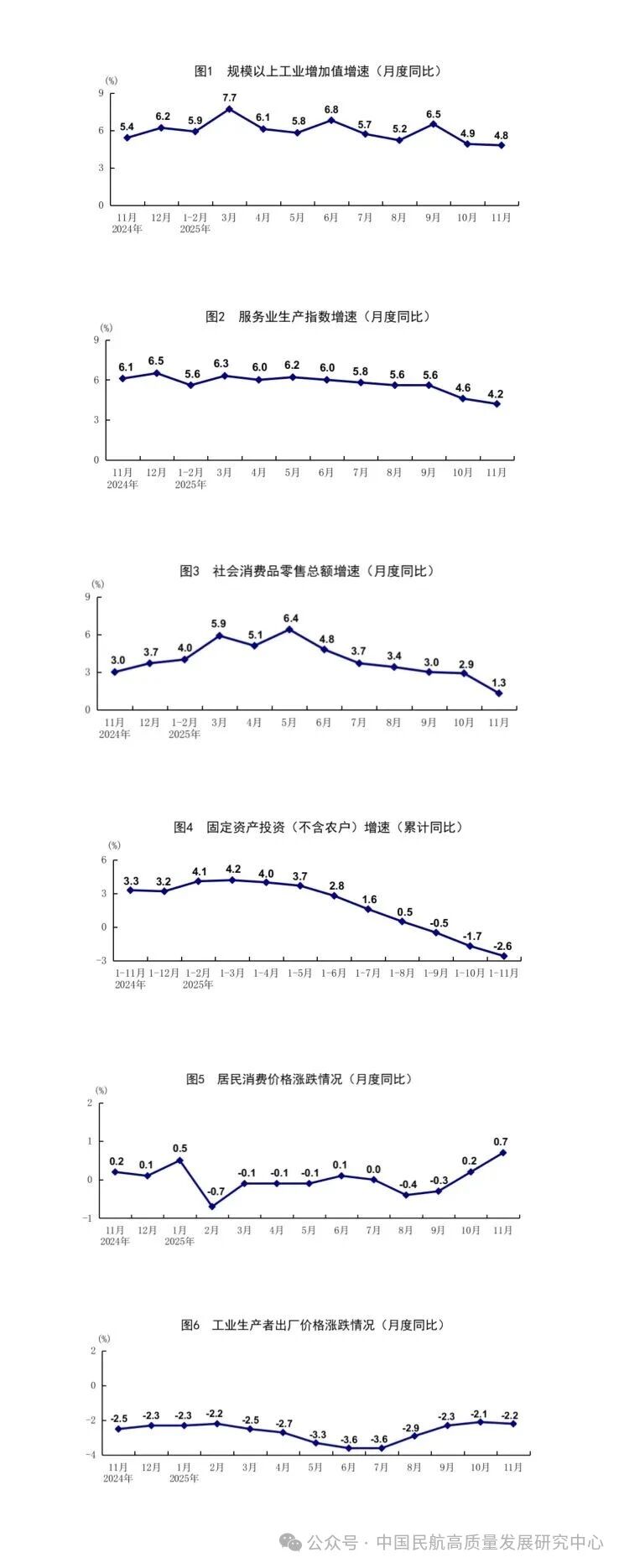 11月份,全国规模以上工业增加值同比增长4.8%,环比增长0.44%。分三大门类看,采矿业增加值同比增长6.3%,制造业增长4.6%,电力、热力、燃气及水生产和供应业增长4.3%。装备制造业增加值同比增长7.7%,高技术制造业增加值增长8.4%,分别快于全部规模以上工业增加值2.9和3.6个百分点。分经济类型看,国有控股企业增加值同比增长4.2%;股份制企业增长5.2%,外商及港澳台投资企业增长3.4%;私营企业增长3.2%。分产品看,3D打印设备、工业机器人、新能源汽车产品产量同比分别增长100.5%、20.6%、17.0%。1-11月份,全国规模以上工业增加值同比增长6.0%。11月份,制造业采购经理指数为49.2%,比上月上升0.2个百分点;企业生产经营活动预期指数为53.1%,上升0.3个百分点。1-10月份,全国规模以上工业企业实现利润总额59503亿元,同比增长1.9%。