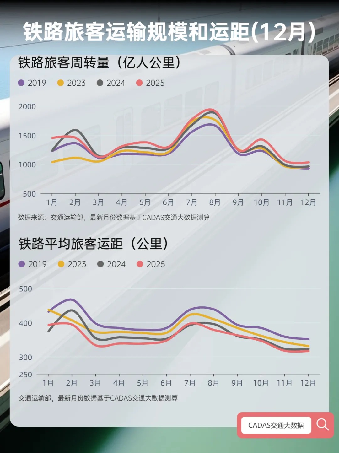 2025年,全国铁路完成旅客发送量46.15亿人次,同比增长约6.5%;预计完成旅客周转量18419亿人公里,同比增长3.3%;平均运距399公里,2024年为411公里,平均运距同比缩短。意味着铁路旅客发送增量以城际短途出行为主。