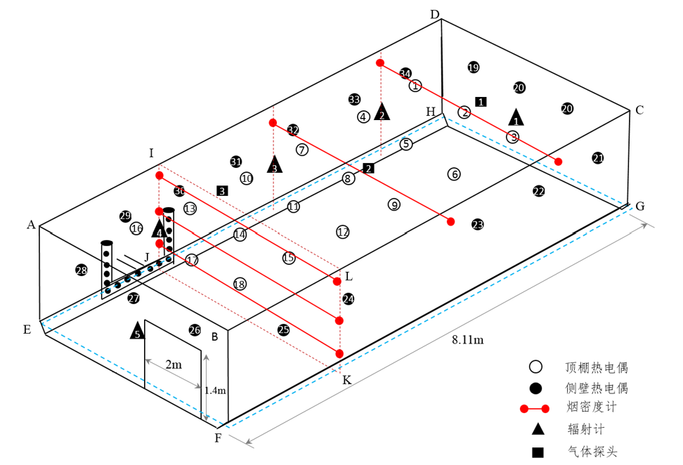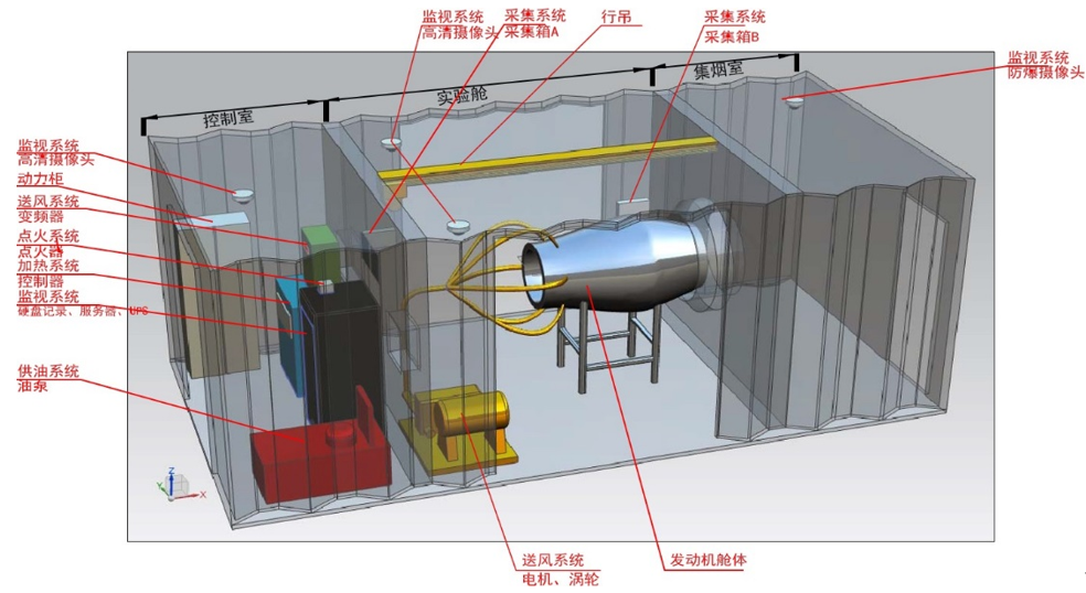 全尺度飞机货舱防火系统性能评测实验平台,可以实现飞机在高空飞行状态下的货舱低温低压环境,模拟飞机在起降过程中的货舱压力和温度变化,实现货物批量装载火灾、集装箱火灾、表面燃烧火灾和气溶胶爆炸模拟等典型的货舱火灾场景,对热释放速率、火灾产烟特性、燃烧产物气体浓度、灭火剂浓度等关键参数进行实时测量。既满足FAA对新型机载防火系统最低性能要求的实验标准,又可模拟真实的飞行环境并采集多方面的实验数据,解决国内缺少可提供低温低压环境条件、能实现典型火灾场景、能对机载防火系统进行全面评测的全尺度飞机货舱防火实验平台的问题。