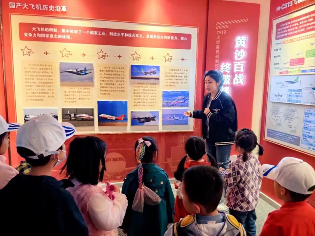 首先,教职工和孩子们参观了适航飞科研大楼的国产大飞机与适航科普教育基地。在学院学生志愿者讲解团的带领下,大家共同了解了国产飞机的历史沿革,以及大飞机C919在设计、制造、试验试飞、适航审定等环节的详细过程。同时,讲解员详细介绍了学校在国家大飞机研制工程中,适航审定领域做出突出成绩和重大贡献。