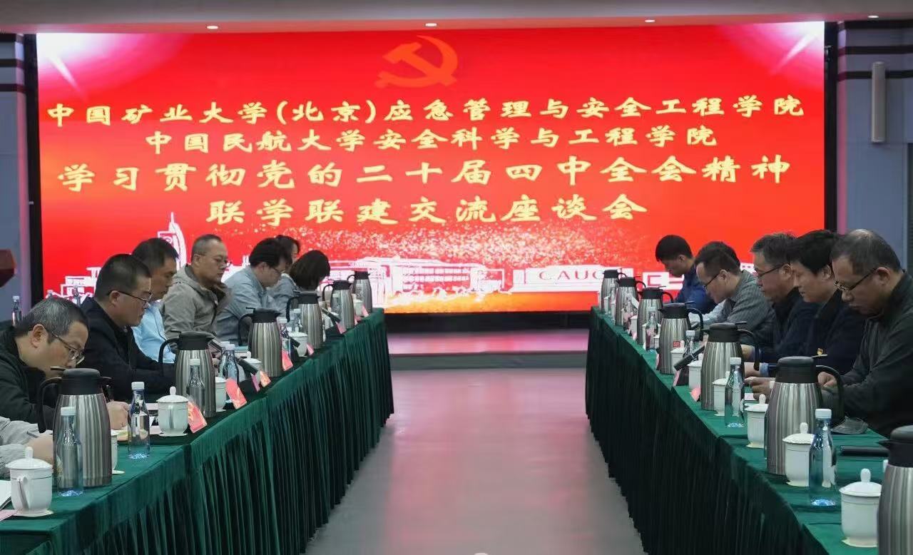 为深入学习贯彻党的二十届四中全会精神及学校第三次党代会精神,切实把思想和行动统一到党中央及学校党委的决策部署上来,助力“双一流”建设提质增效。11月28日下午,中国民航大学安全科学与工程学院(以下简称“中航大安全学院”)与中国矿业大学(北京)应急管理与安全工程学院(以下简称“中矿大安全学院”)在中航大学术交流中心十会议室联合举办学习贯彻党的二十届四中全会精神联学联建交流座谈会。中航大安全学院70余名教师和中矿大安全学院40余名教师共同参加座谈会。