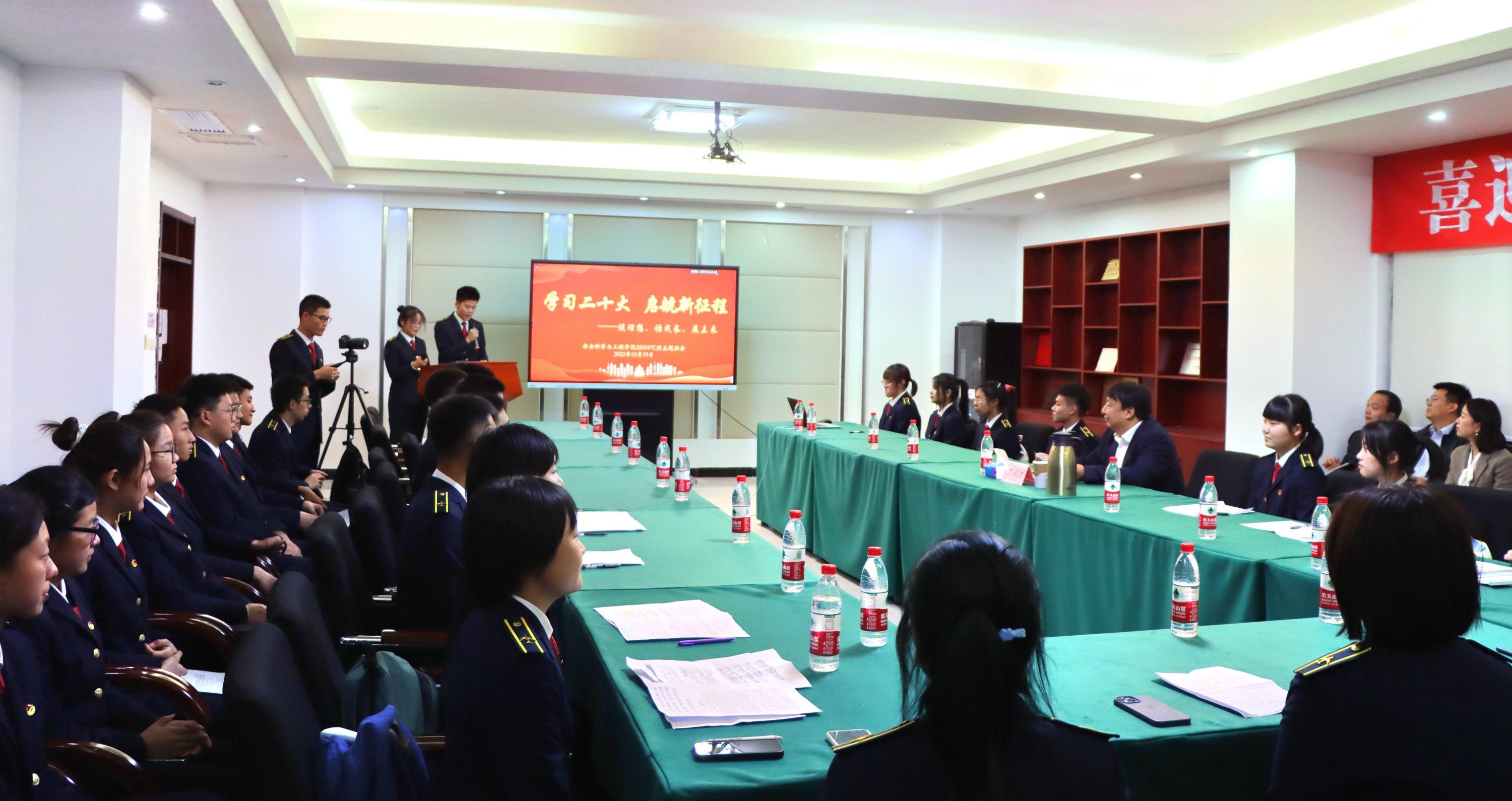 10月19日,安全科学与工程学院220547C班在北教23-501会议室举行“学习二十大·启航新征程——谈理想、话成长、展未来”主题班会,中国民航大学校长丁水汀作为“第二班导师”出席,学院领导班子及学工办相关教师参加。
