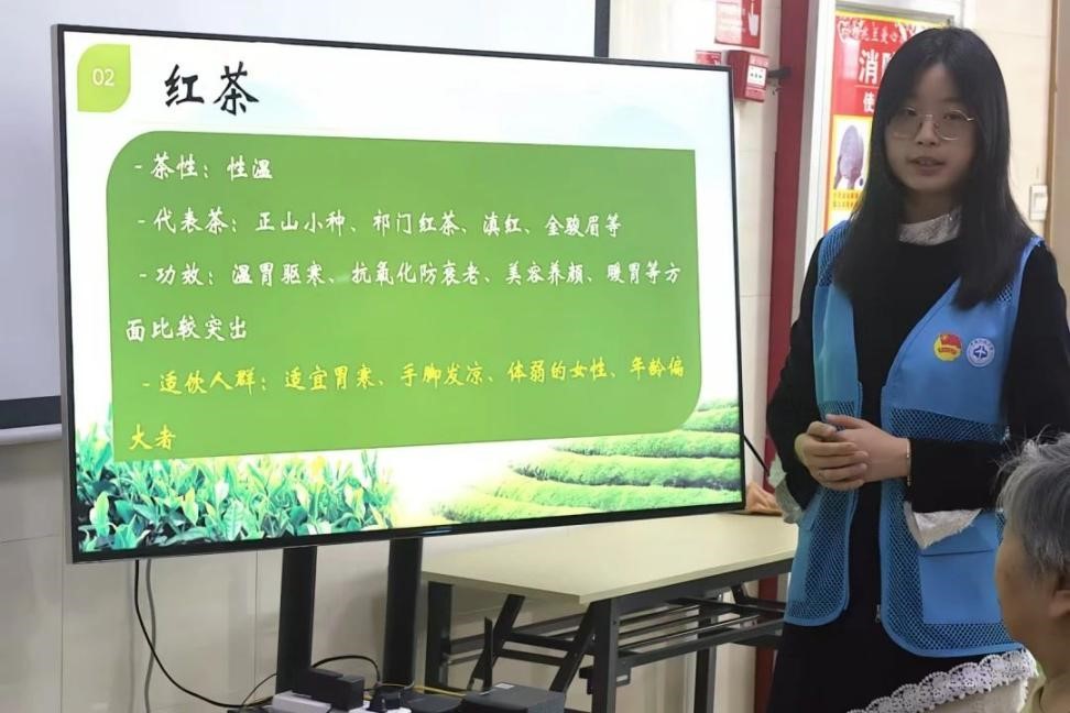 从中国的六大茶系,讲到不同茶的适饮人群和特点;从倒茶的礼仪,到喝茶的姿势,志愿者们用生动的讲解和互动演示,让每一位老人都能感受到茶文化的博大精深。老人们听得津津有味,不时点头赞许,有的甚至分享起自己的饮茶经历,空气中弥漫着欢声笑语与淡淡的茶香。最令人期待的环节莫过于亲手实践所到的喝茶姿势。在主讲人的引导下,老人们纷纷拿起茶杯,按照步骤进行实践。主讲人也及时给予了指导和纠正。夕阳的余晖里,主讲人耐心的身影与老人们耐心学习的背影相叠。那一刻,时间仿佛凝固,只留下茶与情的交融。