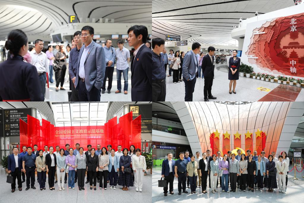 在大兴国际机场航站楼,党员同志们共同参观大兴国际机场全国爱国主义教育示范基地,并到中联航值机区开展参观学习交流;在东航技术北京分公司维修机库,老师们近距离观察航空器定检维修的各个环节,了解先进的维修设备及严谨的作业流程,并与中国民航大学毕业生进行了详细交流,了解他们的工作、生活等情况。