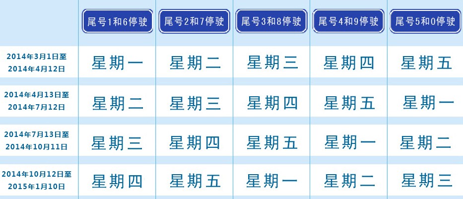 此外,2014年3月1日至2015年1月10日,工作日(法定节假日除外)每日7时至19时,天津市及外埠牌照机动车在外环线(不含)以内道路实施按照车牌尾号区域限行交通管理措施,按照车辆尾号,区域限行的机动车车牌尾号分为5组,定期轮换限行。