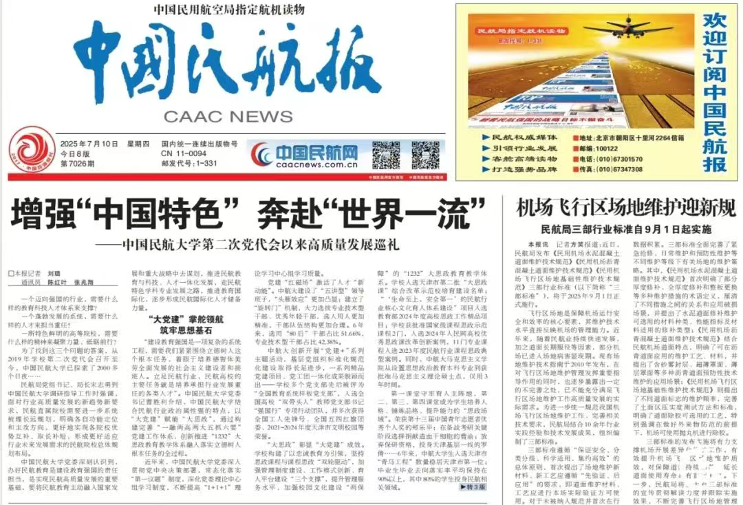 7月10日,在中国共产党中国民航大学第三次代表大会召开之际,《中国民航报》头版头条刊登了题为《奋楫笃行增强“中国特色” 勇毅担当奔赴“世界一流”——中国民航大学第二次党代会以来高质量发展巡礼》的文章,关注中航大第二次党代会以来全面高质量发展的重要举措与成果。