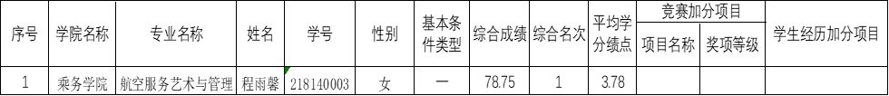 学院依据校发(2021)199号文件《中国民航大学推荐优秀应届本科毕业生免试攻读硕士学位研究生工作办法》及《乘务学院推荐优秀应届本科毕业生免试攻读硕士学位研究生工作方案》相关评审要求,在9月11-12日遴选领导小组对1名学生的申报资格进行评审。现将拟推免学生名单进行公示。