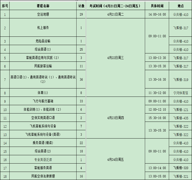 返校报到时间:2026年4月21日8:30在航空服务与安防管理学院教务科(宁河校区飞乘楼-416)报到,领取补考准考证。请各位同学考前一天到达天津,保证按时参加考试。