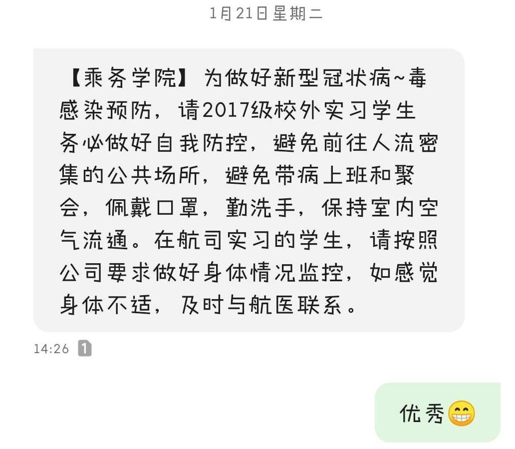 一个人漂泊在外,母校成为了瞿陈露最思念的地方之一,她念念有词着说:“想回去跑操集合,想吃上一次飞行食堂的小笼包,想吃麻辣香锅,想去北四教学楼上自习……”学校和教师们也一直牵挂着在飞实习生们的在外生活。1月21日,瞿陈露收到了来自学校的短信,辅导员和班导师、入党培养人教师先后打来电话关心她和同学们的在飞生活。从1月底开始,通过视频会议,瞿陈露每周都能看到辅导员和班导师,教师们在视频里依次询问每个同学的所在位置、实习情况和身体健康情况;班级里的群聊也是一直活跃,每天都有“老师我刚刚值飞从XX到XX航班,一切平安”的消息。