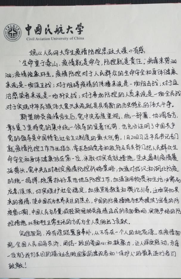 除了报平安的信息,教师和团支书经常在微信群内通知学生利用“青年大学习”“学习强国”等平台学习。3月8日,在学院学生党支部书记的线上组织下,瞿陈露和小伙伴一起在租住公寓完成了教育部社科司与人民网联组织的“全国大学生同上一堂疫情防控思政大课”的视频学习,学生党支部在线上开展热烈的讨论,瞿陈露认真思考,手写下了所思所想。