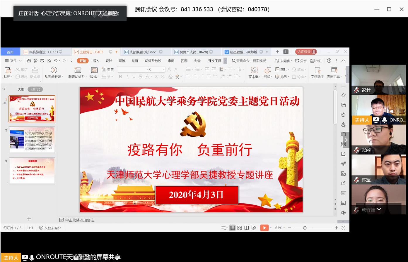 4月3日下午,乘务学院党委通过腾讯会议直播形式开展”关爱教职工心理健康”主题党日活动,特邀天津师范大学心理学部副部长吴捷教授做“疫路有你·负重前行”专题讲座,学院全体教职工参加。吴教授现任天津市学生心理健康教育发展中心主任,在此次疫情期间,他和他的团队承担了教育部、天津市、市教委等面向各级各类学生、教师等层面的心理援助工作,收到了良好的社会效果。