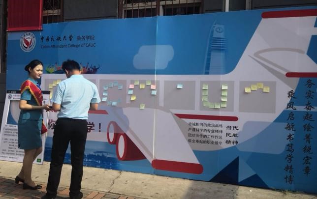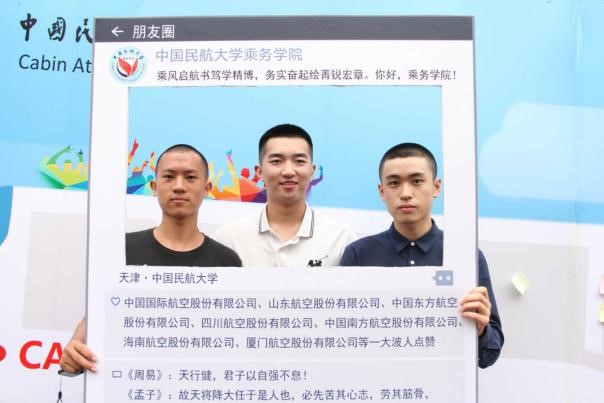 寄于心,见于行。为了让18级小萌新的报到更难忘,我们精心准备了“启航”留影墙,家长寄心声,学生写希望,也留下来到乘务学院的初印象,数百张承载小小期许的便利贴迎风飘动,是别致的风景;乘务学子镂空像让所有学生和家长体验了一次穿制服的感觉;第一条与乘务学院合影的“朋友圈”便得到了各大航空公司的“点赞”,希望新生在谆谆教诲中茁壮成长。
