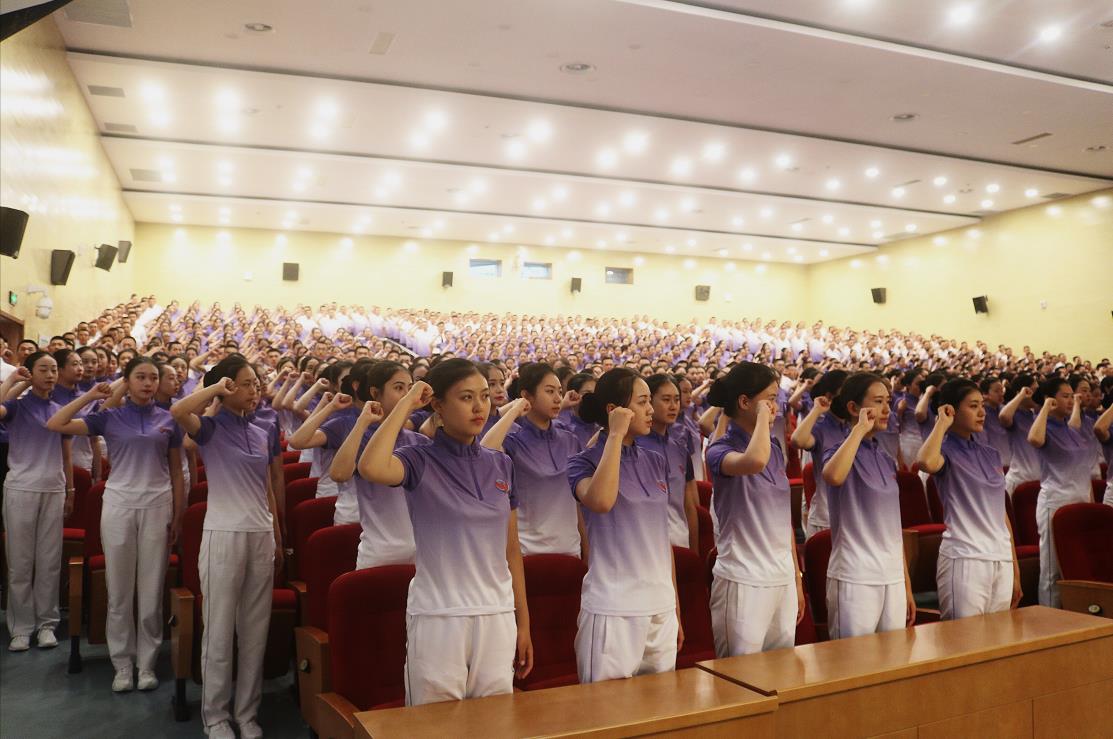 会上,首先播放了2018级军训视频,简要回顾了学生们近20天的军训与入学教育的情况,共同见证了同学们的蜕变与成长。教师代表郑欣欣发言,鼓励大家坚定好好学习的信念。老生代表郭芷若大家分享了自己过去一年多的心得体会。新生代表徐志翔代表全体2018级学生郑重承诺:一定会努力学习、积极向上,不负众望。