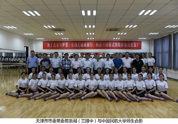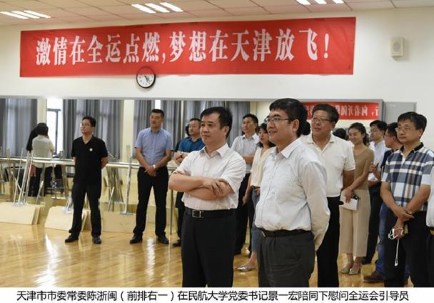 7月14日,天津市委常委、市委宣传部部长陈浙闽莅临中国民航大学,对全运会开幕式引导员排练工作进行视察指导,看望慰问排练师生。中航大党委书记景一宏、党委副书记于剑陪同视察。
