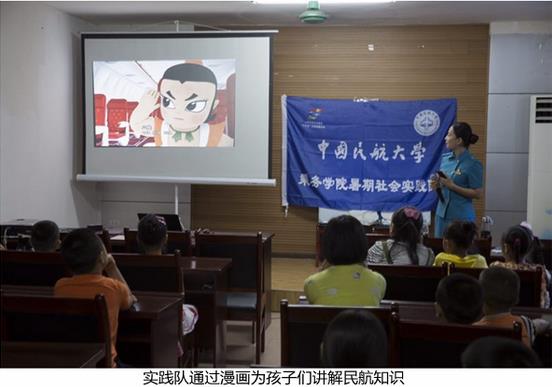 社会实践队员们来到重庆市万盛经开区新田社区为社区内留守儿童开展民航小知识专题讲座以及亲情关爱活动。实践队为孩子们讲解了飞机起飞前、滑行阶段、上升阶段、平飞阶段及其下降阶段机组人员的准备活动及注意事项。