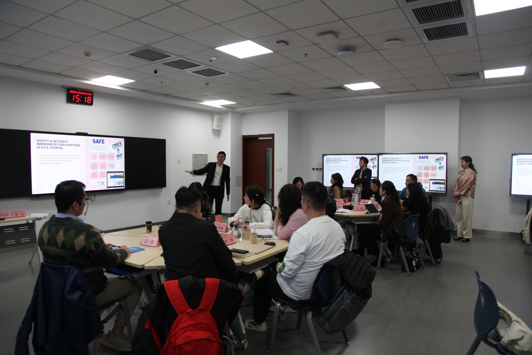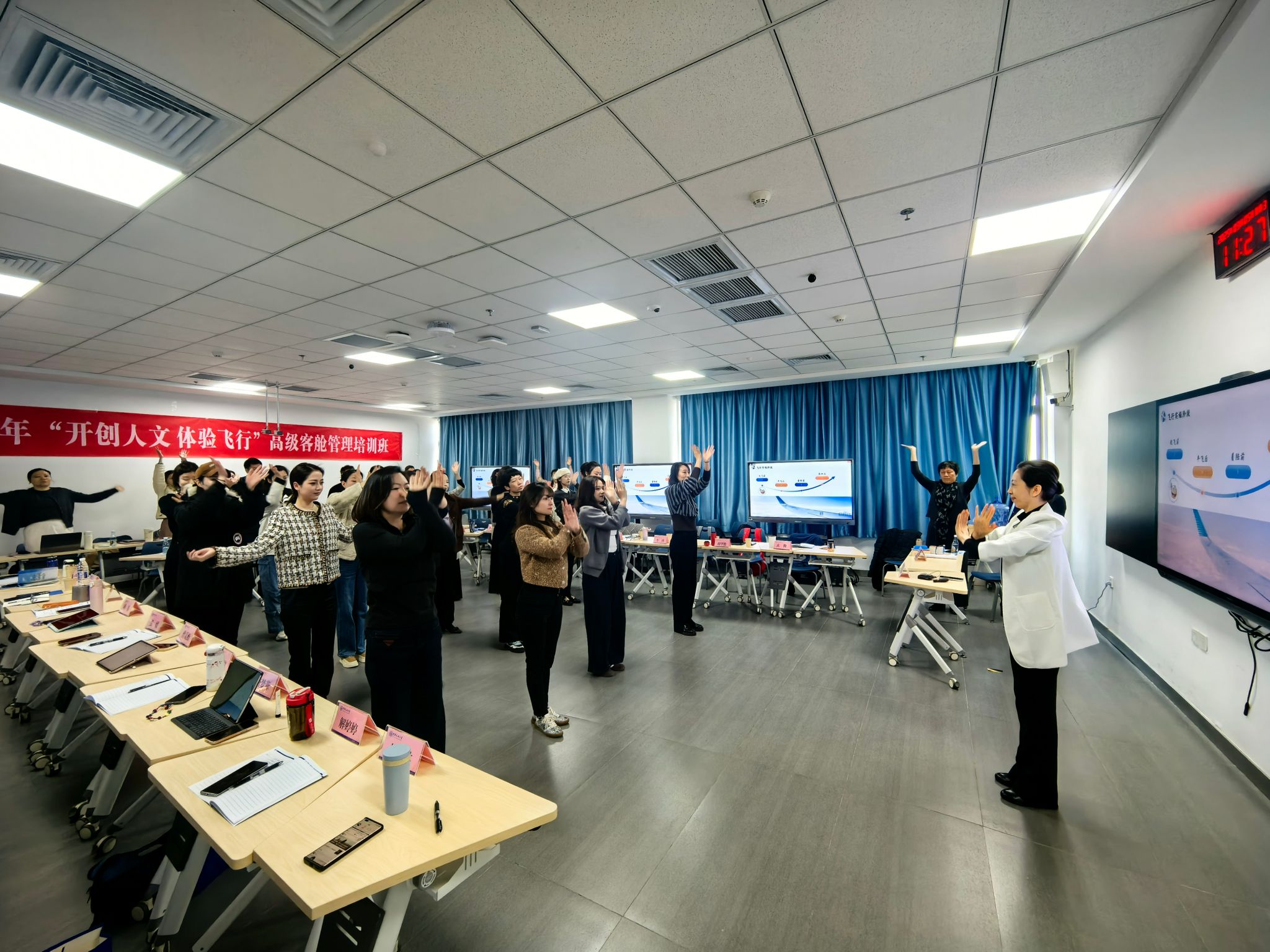 本期培训由中国民航大学、华欧航空培训有限公司等单位联合举办,为期3天,共分两个阶段。第一阶段在华欧航空培训有限公司举行,聚焦模拟机飞行演练,训练提升飞行机组、客舱乘务组与塔台之间协同应对处置机上突发事件的能力。第二阶段在我校宁河校区进行,由乘务学院、新加坡航空等单位的多位专家、教师为学员们授课,内容围绕“外航文化与人文建设”“客舱安全数据分析”“客舱管理语言与行为”等内容进行。