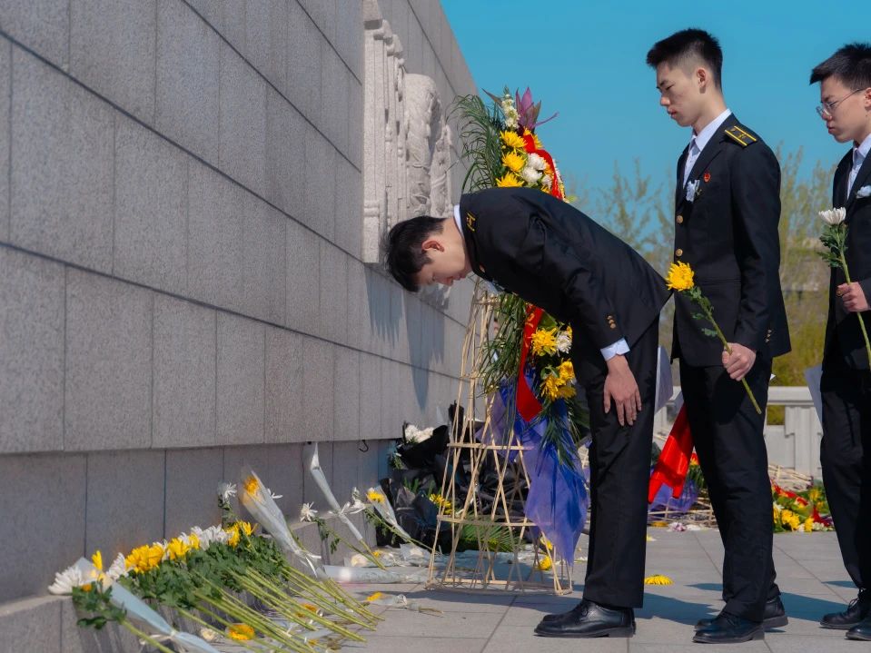 肃立默哀心沉重,一分钟里思纷涌。随后,全体团员肃立默哀一分钟,那一刻,时间仿佛凝固,每个人的心中都充满了对先烈的敬仰和怀念。默哀结束后,同学们手捧鲜花,缓缓走向烈士墓,将鲜花敬献在烈士碑前,表达着对先烈的无限敬仰和深切缅怀。