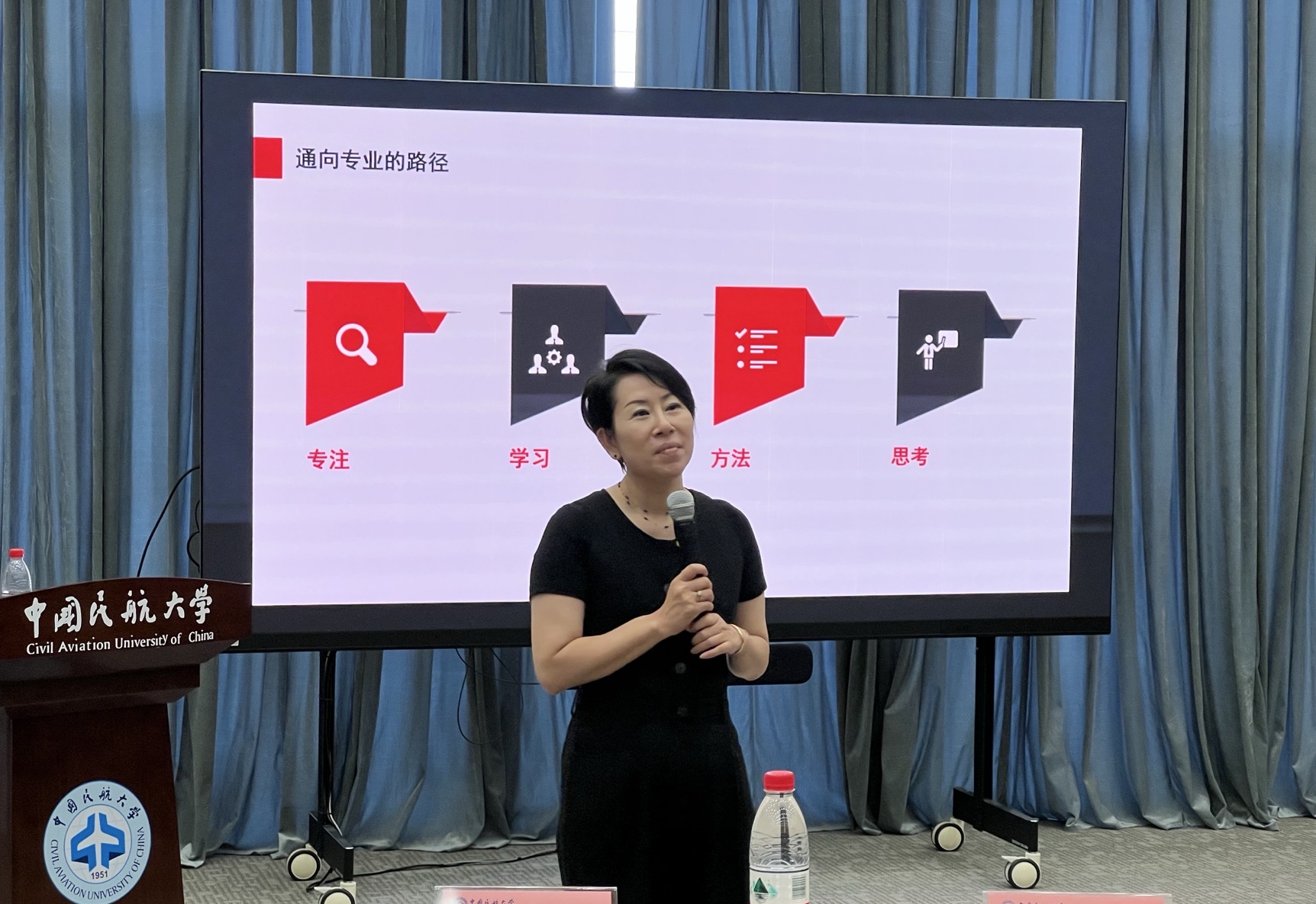 见面会后,企业导师国航天津党群工作部部长、客舱部原副总经理穆锦为学生们带来专题讲座。她结合多年经验提出:“专业”是危机中的从容,源于持续专注、方法沉淀与深度思考”,通过大量鲜活案例,生动诠释民航服务工作的价值维度与能力要求。学生们纷纷表示,讲座既有理论高度又具实践指导性,为职业发展提供了清晰坐标。