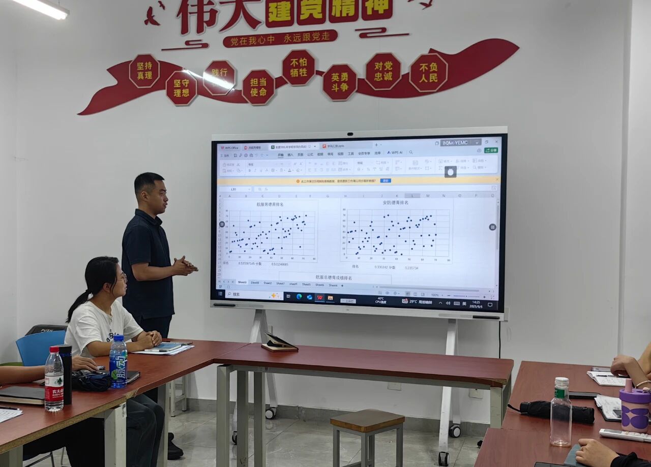 研讨会上,2025级辅导员对新生成绩进行了详细的分析,并针对“四个课堂”建设提出学风作风一体化推动方案。全体与会人员围绕“如何加强作风学风建设”展开热烈讨论,纷纷结合学院特色提出针对性建议。辅导员陈罡从作风与学风数据分析入手,从学生、班级、年级三个层面提出建议;辅导员白雪提出“党建+学风”融合实践,以组织优势赋能新时代民航高素质人才培养;辅导员高博鑫针对学风作风方面现存主要问题,提出针对性的解决方案;辅导员赵璐璐以开展“四大工程”为主线,一体化推进学风作风建设;辅导员程烁宇,针对学生违纪问题,创新性地提出有效方案;辅导员范江磊以“融合赋能提质”为题,提出构建“学风+”思政教育新生态;辅导员王艺萌针对“为何要做”的认识问题、“如何做”的行为问题、“如何坚持”的氛围问题,提出有效的实施方案。