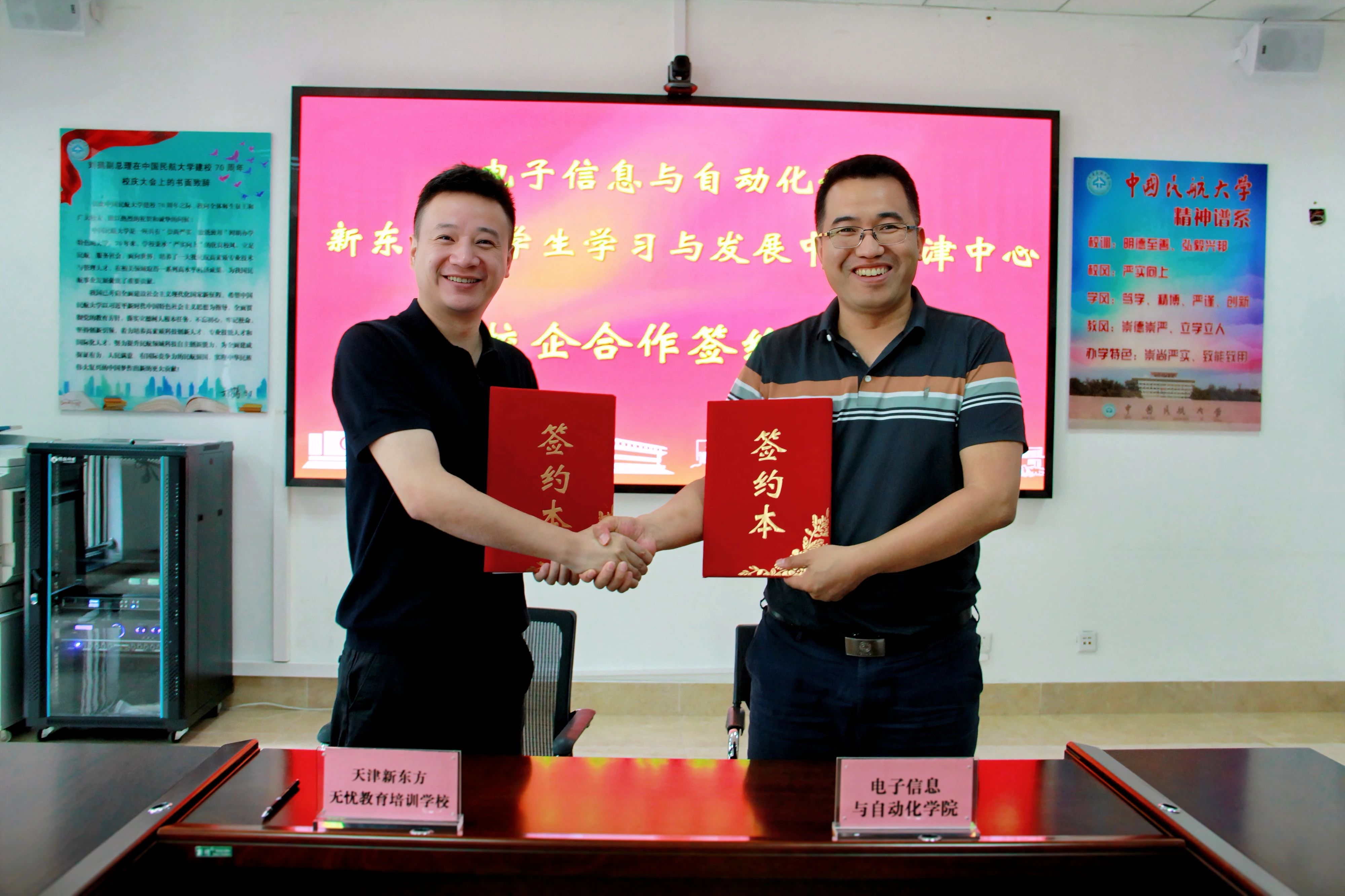 为深化产教融合,拓展协同育人新模式,5月30日,电子信息与自动化学院与新东方无忧教育培训学校举行校企人才培养战略合作签约仪式,新东方大学事业部天津中心校长宗琦、电子信息与自动化学院党委书记出席会议,会议由党委副书记主持,辅导员及学生代表参会。