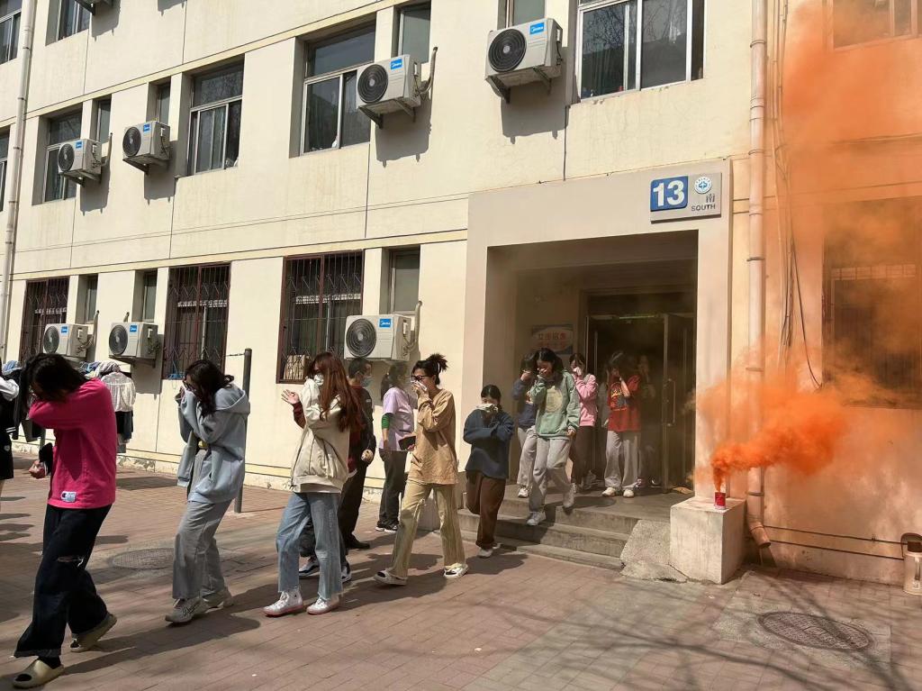 本次消防疏散演练为了增强火灾场景真实性,深度提升学生参与感,选择在学生宿舍楼内进行。演练开始前,学院老师、同学做好充分的准备,对相关工作人员、各班级领队、学生引导员进行培训。演练正式开始后,在宿舍楼仿真火灾点位点烟,学生启动疏散流程,楼长第一时间开启消防广播,并打开门禁,楼内各疏散口、楼梯口等重点区域的引导员迅速就位,引导学生使用湿毛巾捂住口鼻,弯腰低姿态沿疏散标识所示方向有序完成疏散。经演练,学生基本可以在规定的时间内完成疏散,未出现学生困在出口处或人员聚集踩踏等情况。