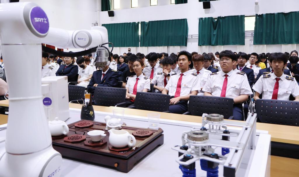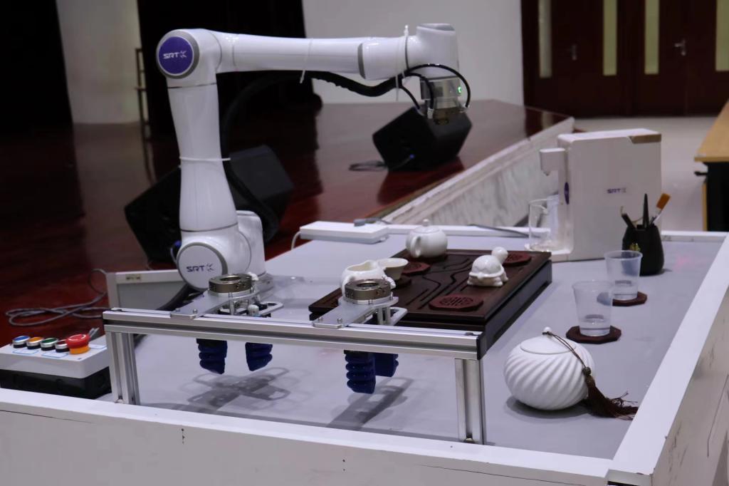 为了加深同学们对软体机器人技术的理解,SRT公司专门将“茶道机器人"设备运送至报告会现场,进行茶饮制作演示。这套茶道机器人设备曾在“党的二十大”新闻中心为国内外媒体记者提供服务,展示中国茶道。随着烫杯、洗茶、回壶、分杯、奉茶,机器人一套行云流水的煮茶动作吸引了学生求知的目光,也激发了学生探索的渴望。