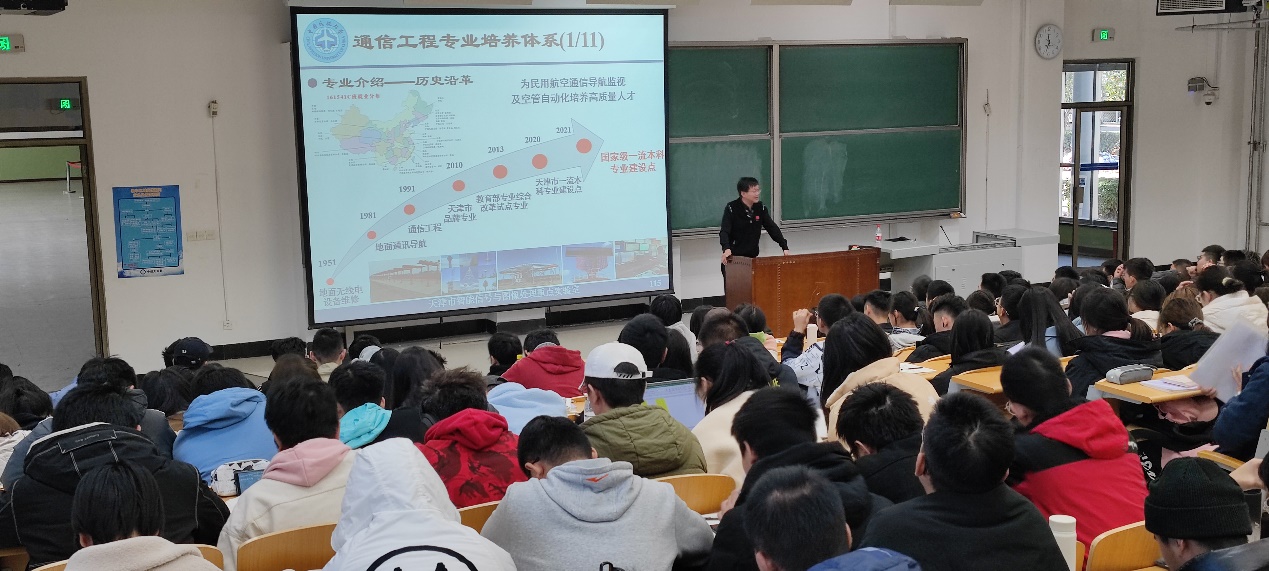 最后,吴仁彪副校长为学生们介绍了主流的国内外民航类院校,包括美国安柏瑞德航空大学、法国国立高等航空航天学院、法国国立民航大学、法国国立机械与航空技术大学、英国克兰菲尔德大学、圣彼得堡国立民航大学、莫斯科国立民用航空技术大学、巴西航空技术学院、中国民航局直属的五所高校、北京航空航天大学、西北工业大学和南京航空航天大学等国内开设民航类专业的大学。在介绍各个民航类院校的办学特点的基础上,列举了通信工程专业开展的国际交流与合作办学情况,包括通信工程专业与美国安柏瑞德航空大学合作开展的“3+1+1”本硕连读项目、中法合办的空中航行方向工程硕士项目和为“一带一路”沿线国家开设国际班等,他再次鼓励同学们积极进取,努力学习,争取向更高的目标迈进,因为读书层次越高,未来选择的机会就越多,发展空间也越大。