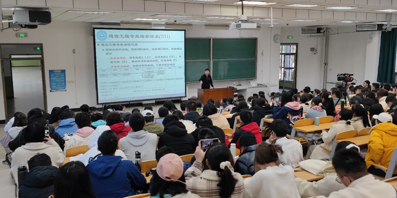 吴仁彪副校长接着对我校通信工程专业的发展历程作了整体的介绍,并列举了近几年通信工程专业在国家一流专业建设、工程认证、国际化人才培养等方面取得的突出成果,为学生们树立专业自豪感和自信心。他对通信工程专业的课程设置方案进行了系统的梳理和分类,详细介绍了通识公共平台课的课程学习进程安排与要求,通过分析牛顿、爱因斯坦和霍金等三位科学大师的成才经历和主要成就,为学生们建立数学、物理等基础知识与通信技术之间的联系,鼓励学生认真学习高等数学、普通物理等基础课程,为专业课程的学习打好基础。针对专业基础课和专业课,他依据课程教学内容的不同,梳理了课程之间的逻辑顺序关系,将课程进行了分类整理,包括信号处理类课程、通信类课程、场类课程、电路类课程、核心专业课程、导论类课程、实践类课程和综合设计类课程等。