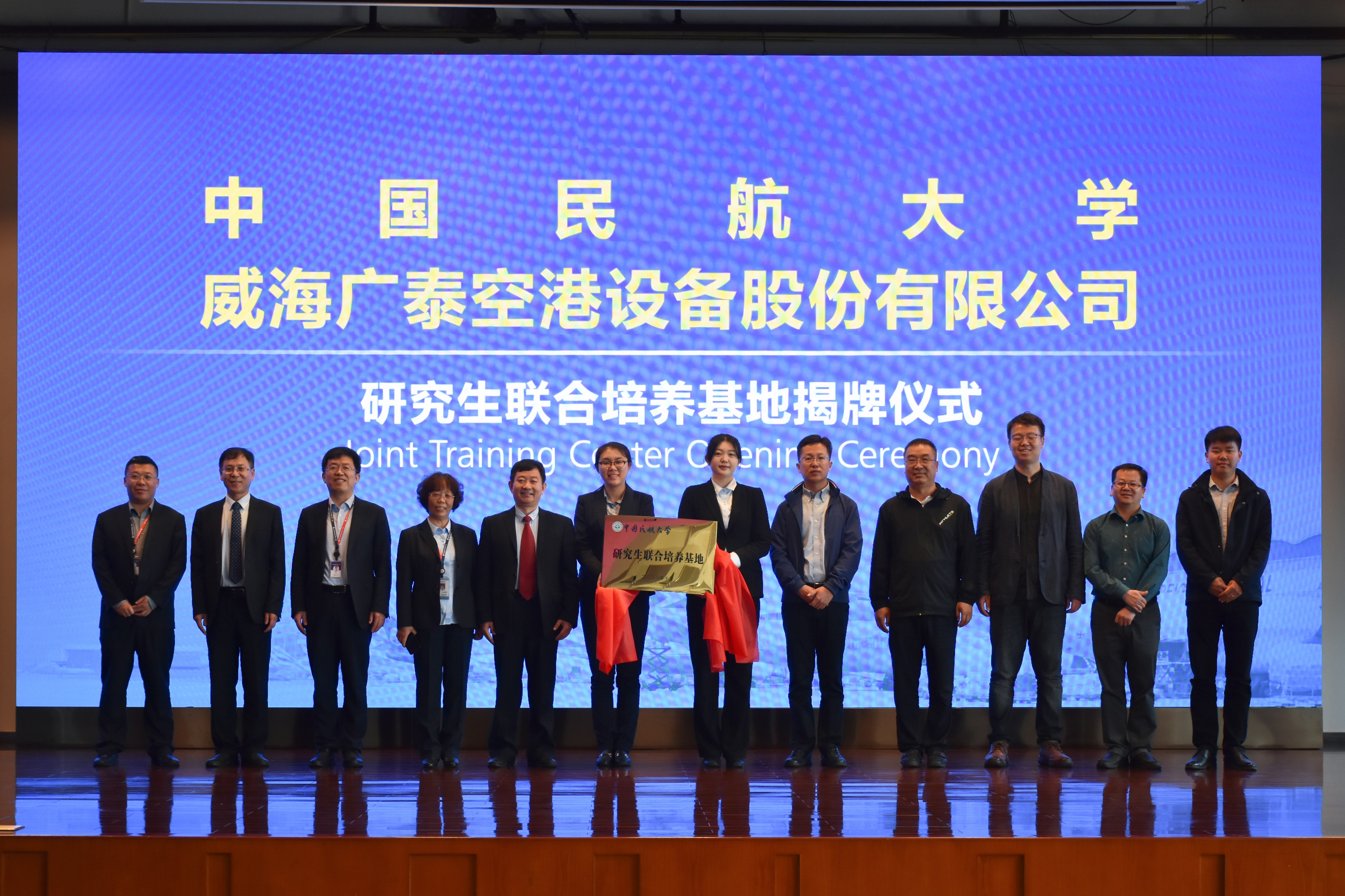 5月13日上午,中国民航大学电子信息与自动化学院与威海广泰空港设备股份有限公司(简称“威海广泰”)共建研究生联合培养基地揭牌仪式在威海广泰大礼堂举行。威海广泰常务副总经理王明亮、中国民航大学研究生院副院长洪振宇共同为研究生联合培养基地揭牌并讲话,电子信息与自动化学院副院长邢志伟、威海广泰总经理助理罗丽、广泰学校校长孙乾胜、威海广泰人力资源中心副主任王金山及中国民航大学电子信息与自动化学院有关人员参加。