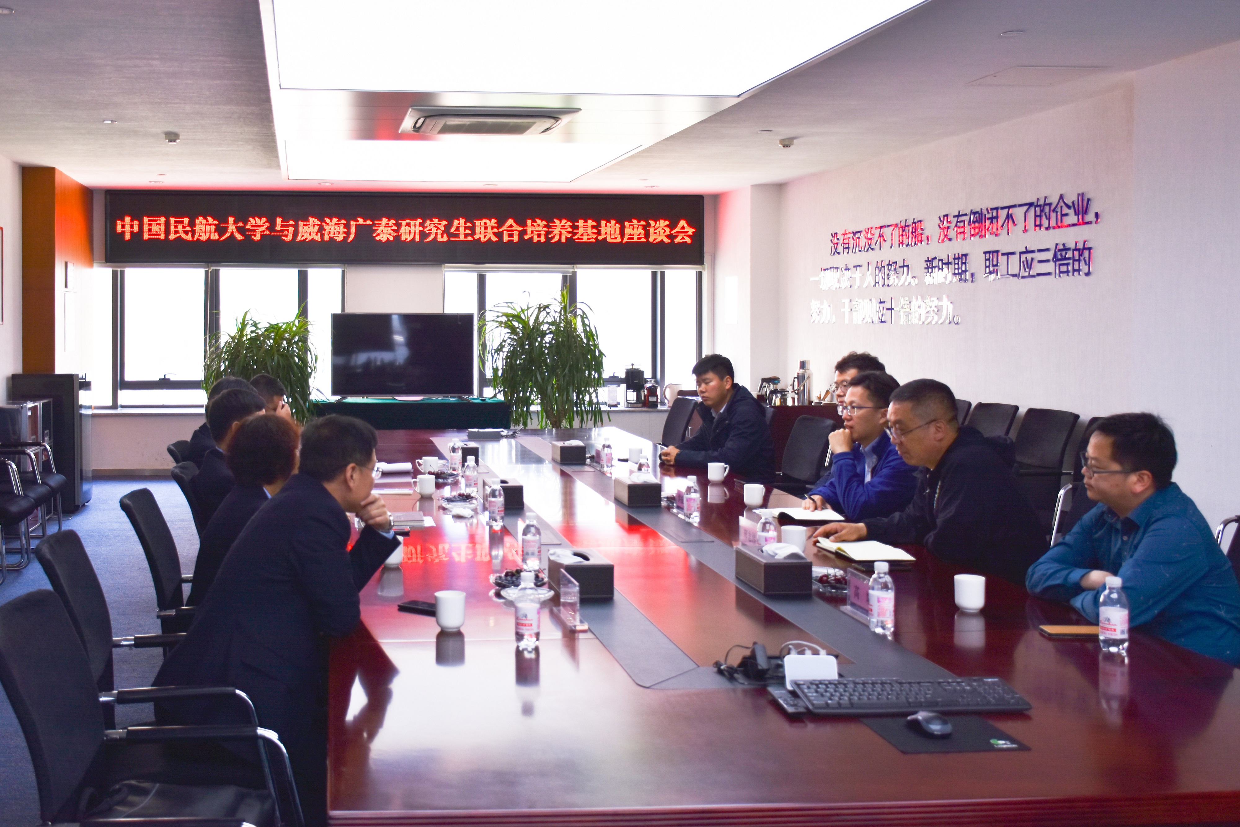 揭牌仪式结束后,双方与会代表进行了座谈与广泛交流,一致认为要借助研究生联合培养基地这一平台,共同做好专业学位研究生的联合培养工作,切实提高研究生培养质量。在合作措施方面,将依据企业的科研项目和技术需求,及研究生课程建设、实践训练等现实需求,每年派遣一定数量相关专业的研究生到企业进行实践活动,并做好实习研究生的学位论文选题和研究工作,力争达到校、企、学多赢的目标,即企业的技术问题解决了、学生的实践与研究能力提高了、企业选人用人的途径拓宽了。期间,与会人员参观威海广泰羊亭工厂及广泰培训学校,了解广泰人三十年来取得的科研成果及其应用情况。