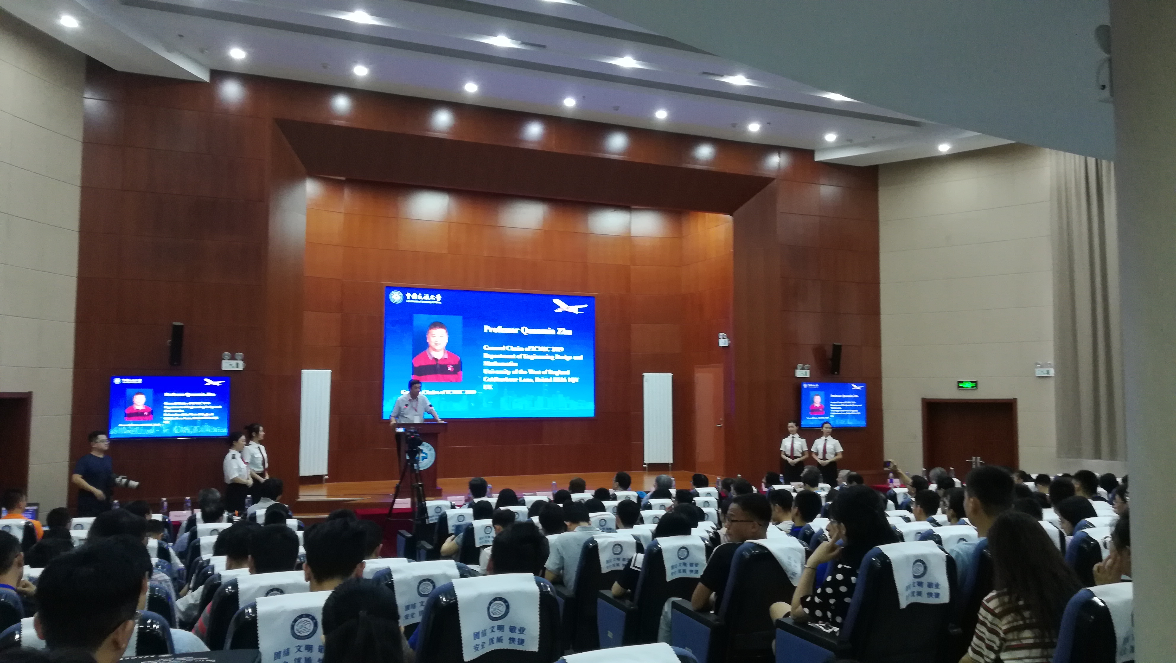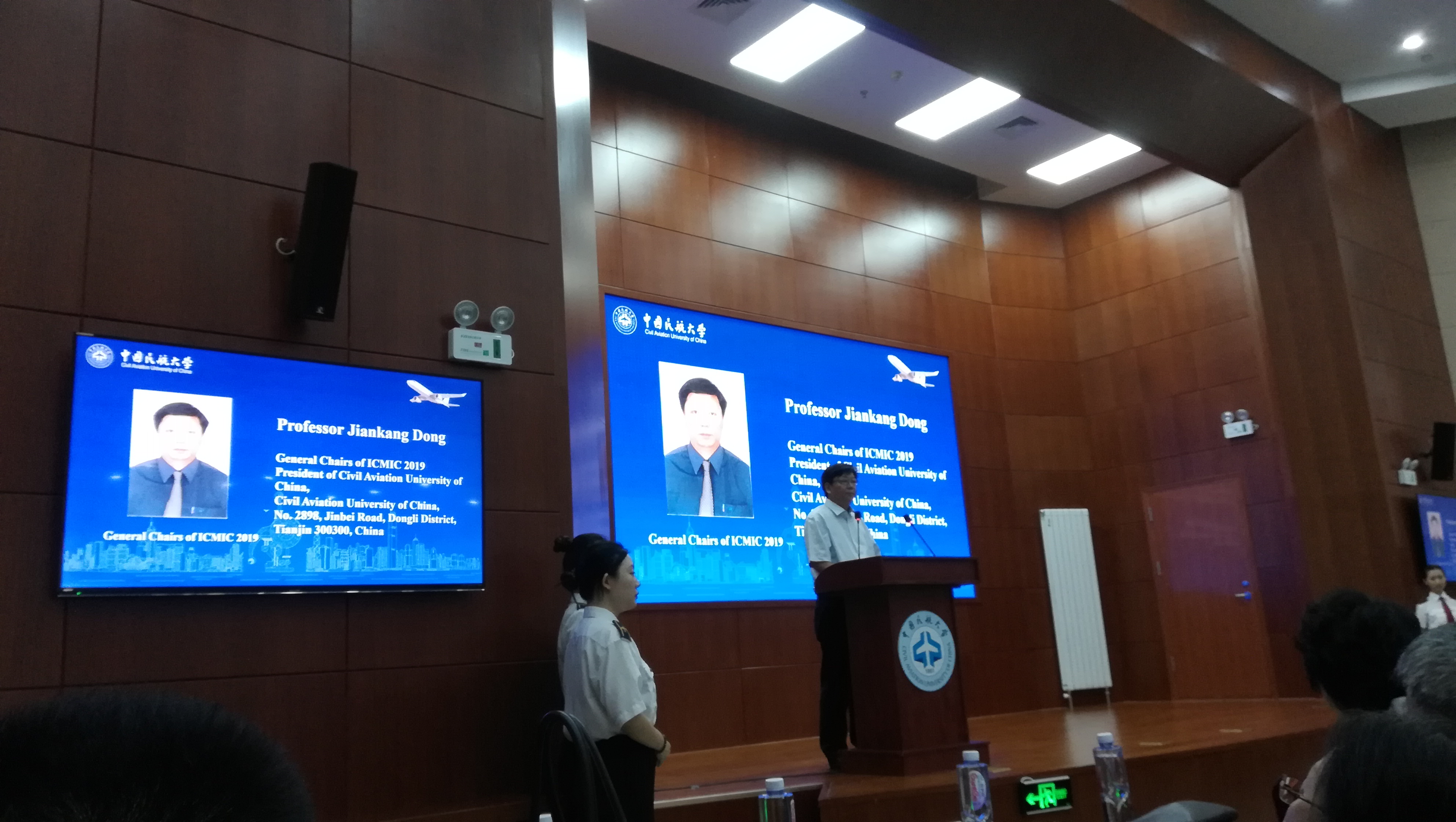 出席本次会议开幕式的嘉宾有:中国民航大学校长、ICMIC2019大会主席(General Chairs)董健康教授,国际自动控制联合会会员、ICMIC2019大会主席(General Chairs)朱全民教授;中国民航大学电子信息与自动化学院院长、ICMIC2019组织委员会主席(Organisation Committee Chairs)韩萍教授;中国民航大学电子信息与自动化学院副院长、ICMIC2019组织委员会主席(Organisation Committee Chairs)高庆吉教授;中国民航大学电子信息与自动化学院、ICMIC2019执行主席(Program Chairs)王蕊博士。参加开幕式的还有来自突尼斯迦太基大学(University of Carthage)、香港城市大学(City University of Hong Kong)、纽卡斯尔大学-新加坡(Newcastle University in Singapore)、图卢兹第三大学(Université Toulouse III – Paul Sabatier)、东京农工大学(Tokyo University of Agriculture and Technology)、巴西利亚大学(University of Brasilia)、欧道明大学(Old Dominion University)、康考迪亚大学(University of Concordia)等20余名国际知名专家学者,以及北京航空航天大学、北京科技大学、南开大学、江南大学、天津工业大学、中国民航大学等近200名代表。本次会议全程使用英文进行学术交流和探讨。