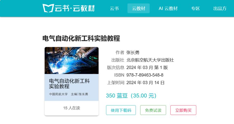 我院张长勇老师编写的交互式数字云教材《电气自动化新工科实验教程》已于近日由北京航空航天大学出版社正式出版、云端上架。