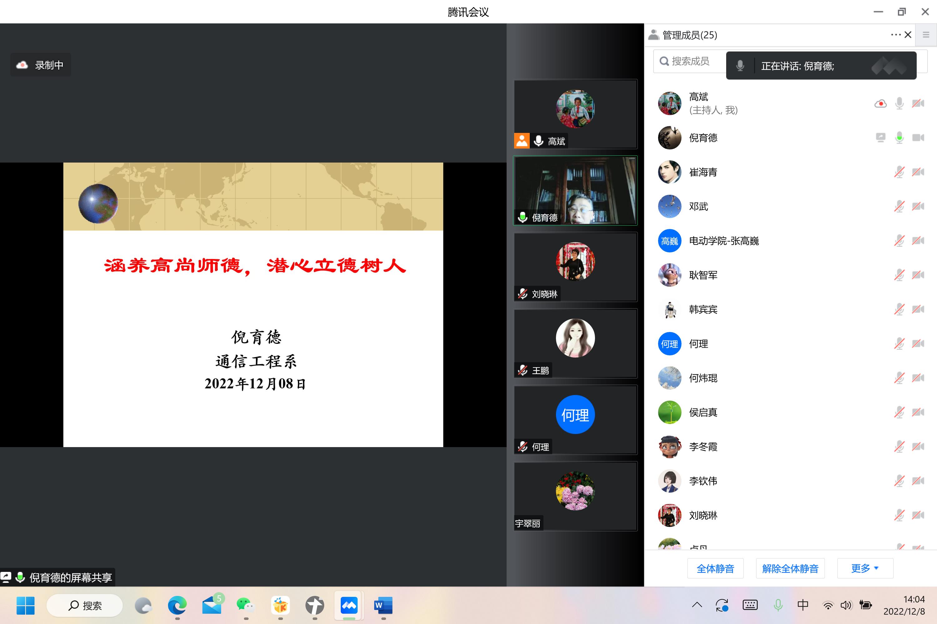 为全面贯彻落实党的教育方针,持续推进师德师风建设,团结凝聚广大教职工更好担负起立德树人根本任务,电子信息与自动化学院分会于12月8日下午,通过线上举办“以德立身、以德立学、以德施教、以德育德”师德大讲堂活动,邀请到通信工程系倪育德教授和自动化学院系邓武教授分别开展专题讲座。学院党委书记、工会主席邢敬文,学院工会委员以及部分教师代表聆听了讲座。