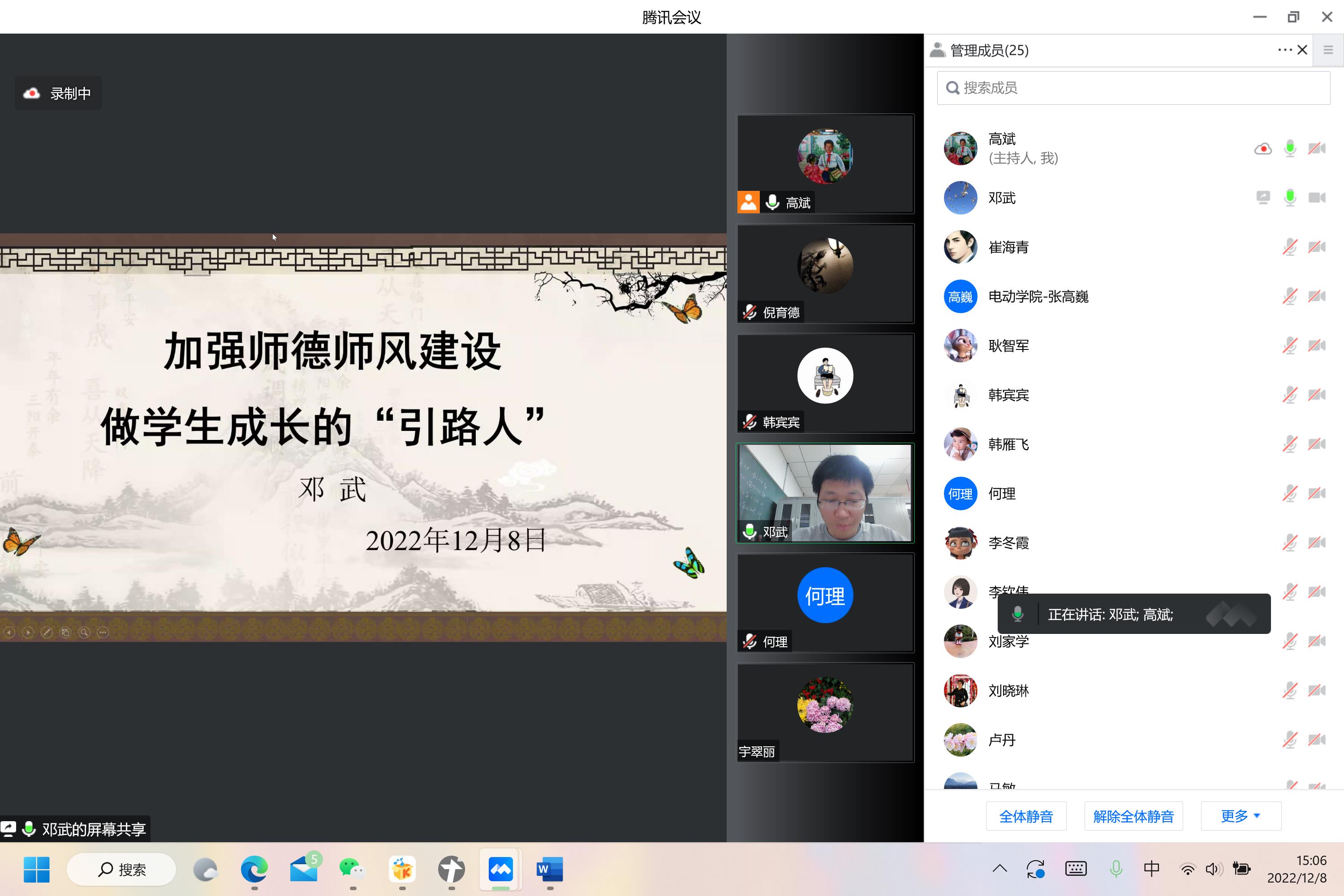 邓武教授以《加强师德师风建设,做学生成长的“引路人”》为题开展专题讲座,他主要从教师、师德、师风相关要求;违反师德师风的典型现象及根源;立师德,树师风,做好学生引路人的几点思考;以及以德立学,为国家培养新时代人才四方面展开。明确教师是人类灵魂的工程师,是落实科教兴国战略、推进教育创新、全面实施素质教育的主导力量,是学生增长知识和思想进步的指导者和引路人。