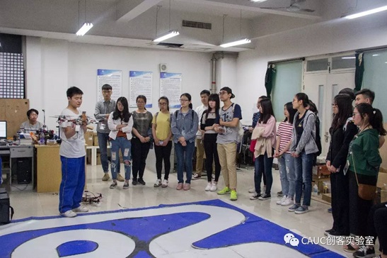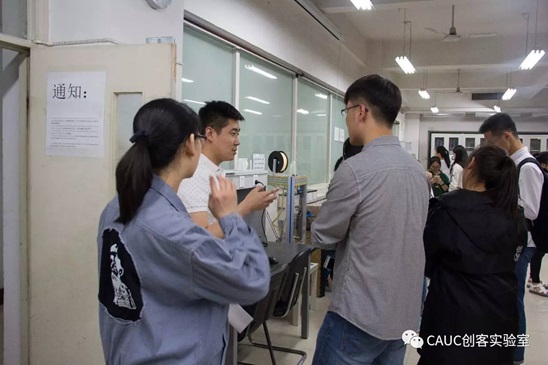 同时由实践基地里的同学给选修课程的同学们演示了他们在实验室中制作的作品,与前来交流的同学们讨论了参加的学科竞赛的经历和意义。