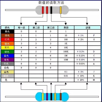 为了便于从任何一个角度都能看清电阻的阻值采用了在电阻器上标注不同的颜色圆环来表示阻值和误差的方法。下图中的两个电阻器就采用了色环法来标注阻值和误差,其中一只电阻上有四条色环,称为四色环电阻器,另一只电阻器上有五条色环,称为五色环电阻器,五色环电阻器的阻值精度较四色环电阻器更高。