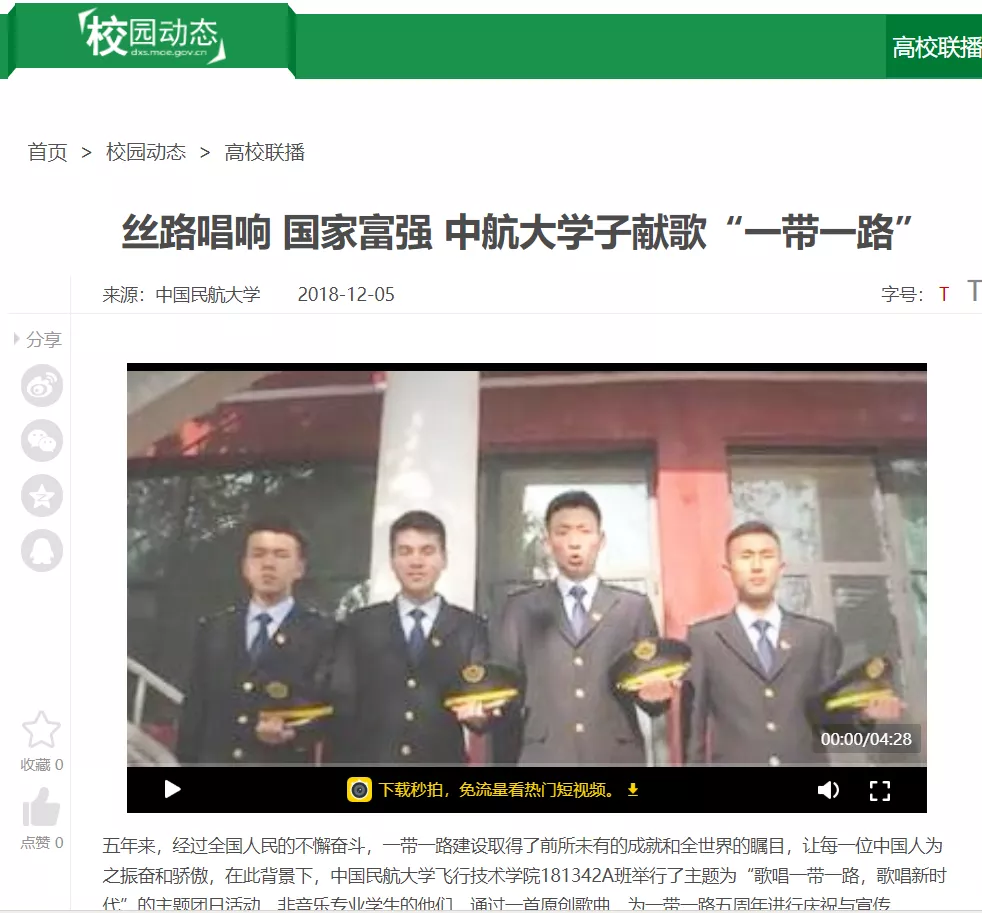 工作上有贡献。在班长、区队长、学生会主席等岗位中磨砺青春。带领班级创作歌曲MV《丝路唱响国家富强》献礼“一带一路”倡议发布五周年,先后在中航大官网、搜狐新闻网等平台报道,获中国大学生在线“年度人气原创内容奖”。