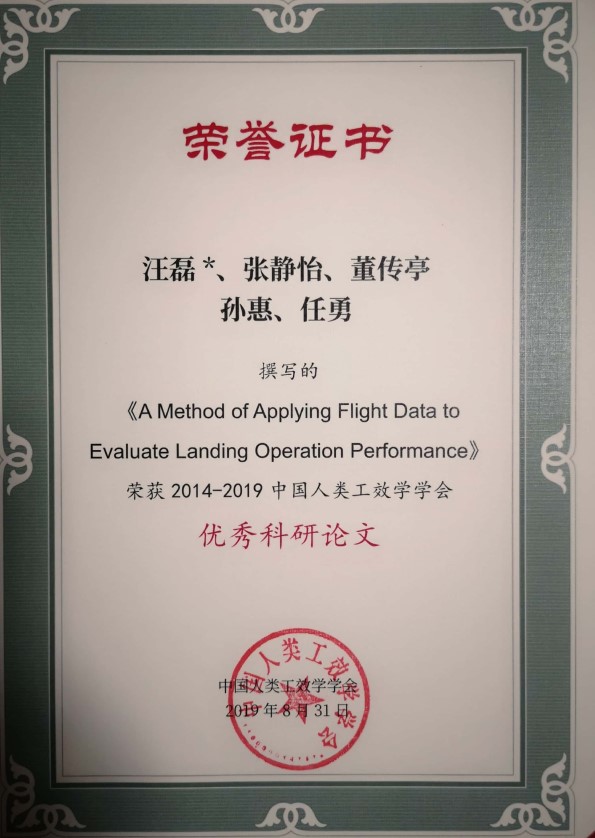 为促进我国人类工效学的理论研究与应用实践,展示我国人类工效学科研人员的优秀研究成果,进一步提高我国人类工效学的科研水平,中国人类工效学学会组织开展了2014-2019 年优秀科研论文奖评选活动,近期获奖名单公布,我院汪磊副研究员撰写的论文《A Method of Applying Flight Data to Evaluate Landing Operation Performance》(发表在人因领域顶级期刊《Ergonomics》)获奖,此次在全国范围内一共仅有30篇论文获此殊荣,颁奖仪式将在2019年中国人类工效学学会全国会员代表大会暨学术会议上进行。