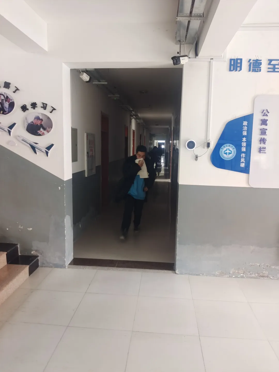 演练现场模拟了学生公寓房间发生火灾,物业人员发现火情后,随即拉响应急警报铃并向学院后勤部门报告,同时向119模拟电话报警。全体学员听到警报铃后立即拿起毛巾浸湿捂住口鼻、弯腰前行,从安全通道、紧急疏散路线快速有序疏散,撤离楼宇。学员撤离至安全地点后飞行大队清点人数,确保不少一人、全员撤离。