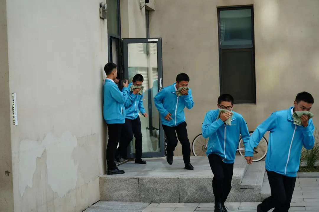 随着警报拉响,演练正式开始。随着宿舍楼消防警报鸣起,学生们反应迅速、操作规范,用湿毛巾捂住口鼻,依照预设的安全疏散路线,分别从各楼层的不同安全出口有序撤离。