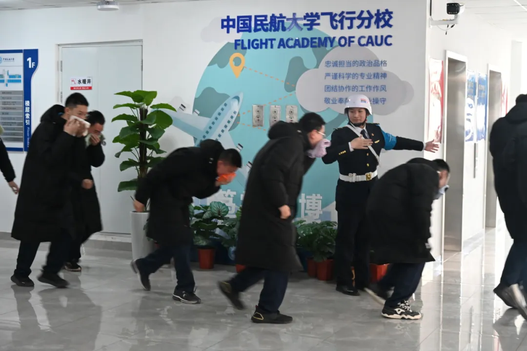中国民航大学飞行分校于2025年2月28日组织全体飞行学员开展火灾逃生演练。