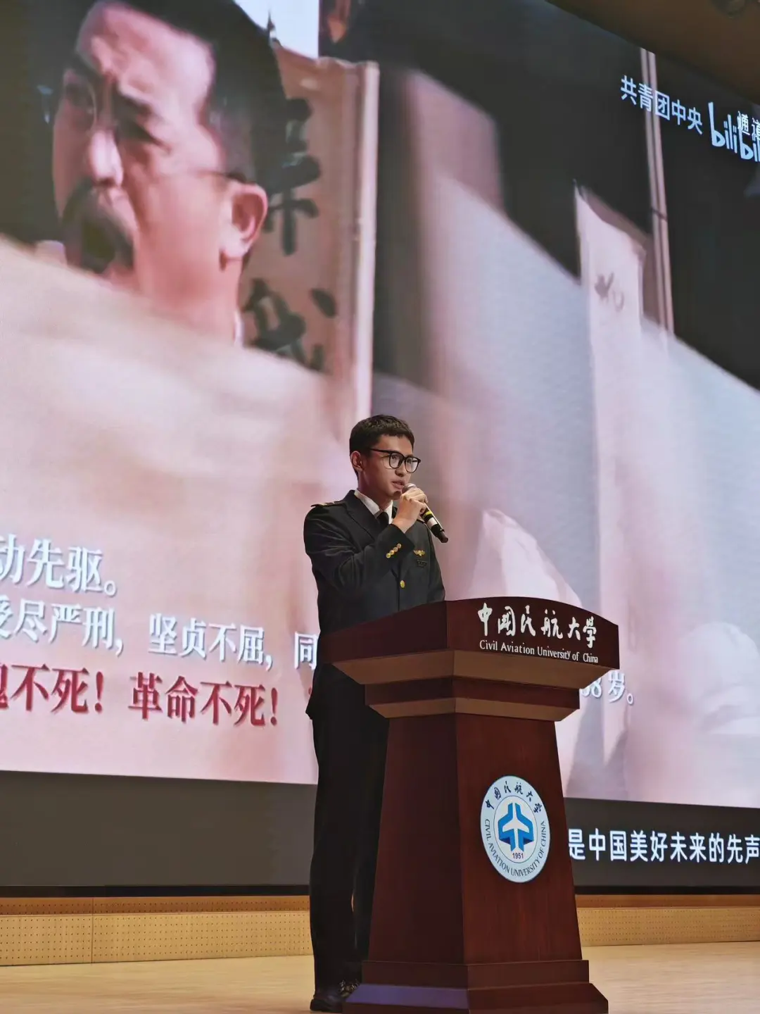赵冠雄同学的演讲以青春是什么开幕,用一群中国青年的觉醒照亮了青春为题,列举了陈延年、陈乔年英勇就义,陈望道为了尽快翻译完共产党宣言,蘸着墨汁吃下糖粽子却直呼粽子真甜等的革命精神,引发了观众的沉思。接下来他结合两航起义,模拟了甘嘉霖机械师对祖国的向往的场景,最终以频率里的欢迎两航回到祖国怀抱作为结尾。“这里是新中国,欢迎回到祖国怀抱!”。