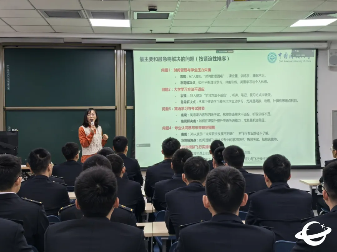 王艳红老师从行业安全管理理念的演进切入,阐释了大数据在飞行技术标准量化与系统性风险分析中的关键作用。她强调扎实的数理基础是培养“技术+管理”复合型人才的重要支撑,直接影响学生未来分析复杂问题、做出专业研判与决策的核心能力。结合往届学员的发展实例,她进一步说明了时间管理对学业成效的支撑作用,引导学生深入思考个人成长与专业价值观的融合路径,鼓励大家尽早确立目标、持续积累、稳步前行。在互动环节,同学们围绕时间分配、学习动力等问题积极提问,王艳红老师与杨晓天一一予以细致解答,交流深入,反响热烈。